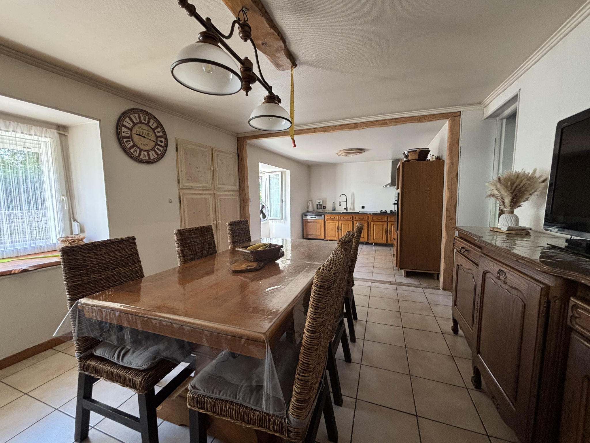 L'habitation comprend : une cuisne ouverte sur une salle à manger avec un insert, un grand salon de 34m² avec , également un insert et un poële à granulés , une salle de douche moderne , un toilette et une cave.