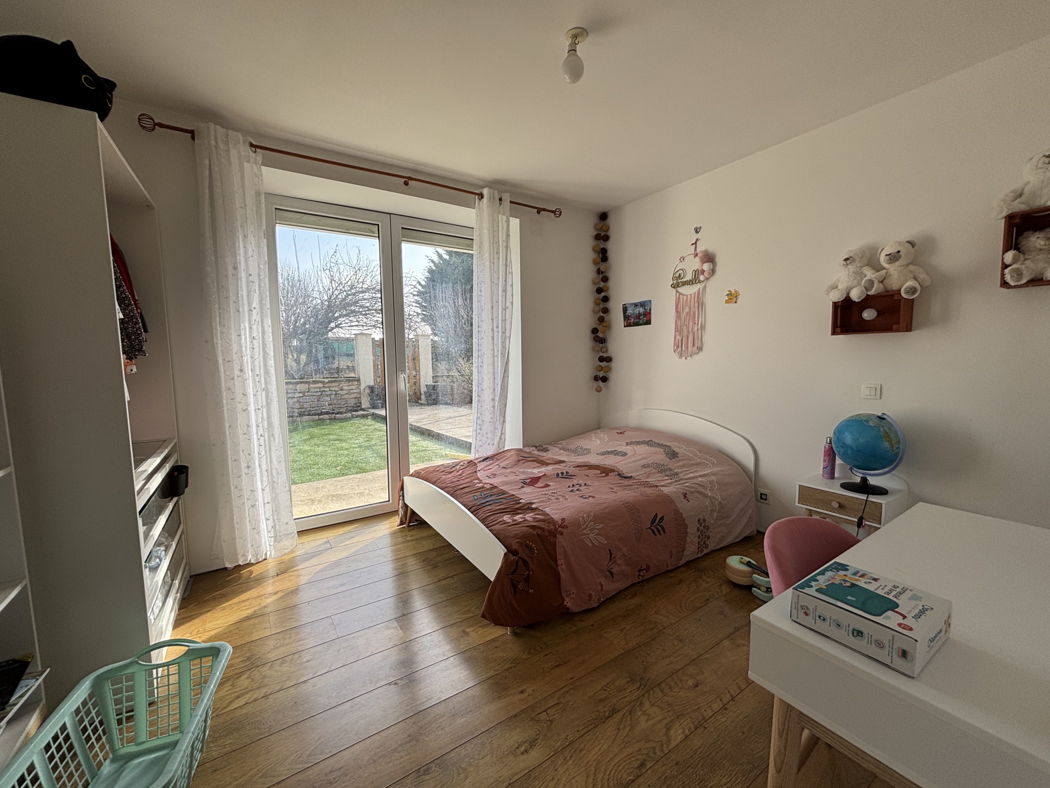 Le côté cuisine, moderne, avec cellier s'ouvre sur un grand salon de 30 m² environ avec deux baies, terrasse et pergola.