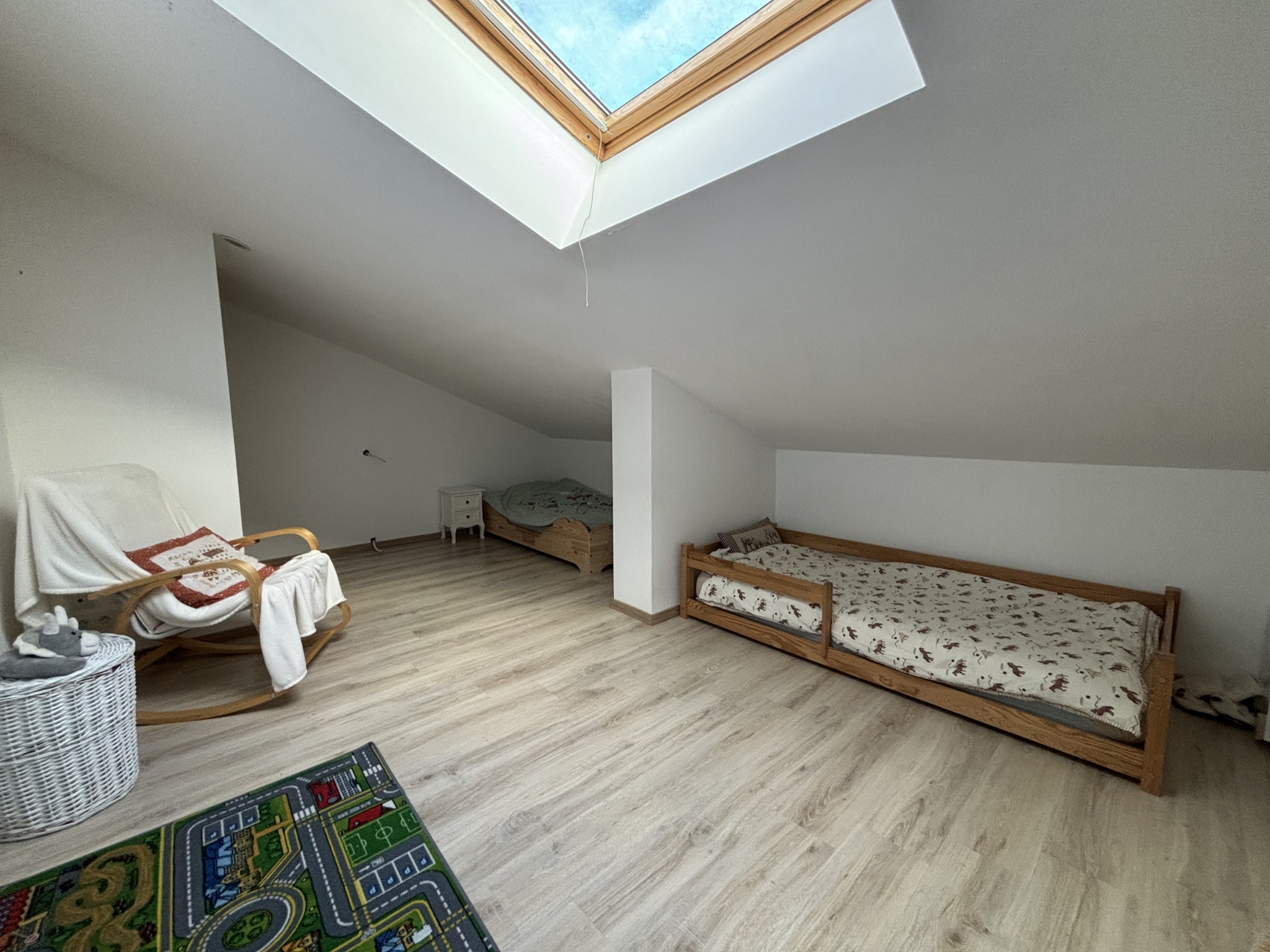 L'entrée spacieuse donne accès à une salle à manger (20,55 m²) proche de la cuisine, suivie d'une grande pièce de jeux de 19 m² ;